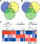 Figure 2. Analysis of differentially expressed unigenes during Microhyla fissipes metamorphosis.Venn diagrams show the number of genes significantly (a) up-regulated and (b) down-regulated; green, blue and yellow circles represent the changes from PM to MC, MC to CM, and PM to CM, respectively. (c) Similarity of the expression profiles between genes with hierarchical clustering is shown above the heatmap. Intensity of color indicates expression levels, and the three major clusters represent the PM, MC and CM stages.