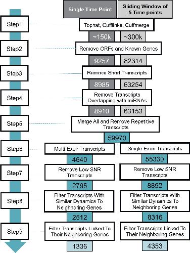 LncRNA discovery pipeline. The output of Cuffmerge (step 1) goes through multiple filtering steps to remove unqualified lncRNA genes and any transcripts with coding potential (step 2), short transcripts (step 3), miRNAs (step 4). These processes are performed in parallel rounds for single time points and also using pooled reads over a sliding window of 5 time points). After these commonly used filtering steps, the remaining transcripts are combined as one set and one representative transcript model is kept among the overlapping transcripts (step 5). Then, multi-exon and single-exon lncRNA candidates are separated (step 6). After removing the lncRNA candidates with less than 5 consecutive time points of non-zero expression, the SNR threshold is applied (step 7). We remove any potential lncRNA candidates that have the possibility of being part of exons of a neighboring gene (step 8 and 9). Our final lists of lncRNAs are 1336 multi-exon lncRNAs and 4353 single-exon lncRNAs.