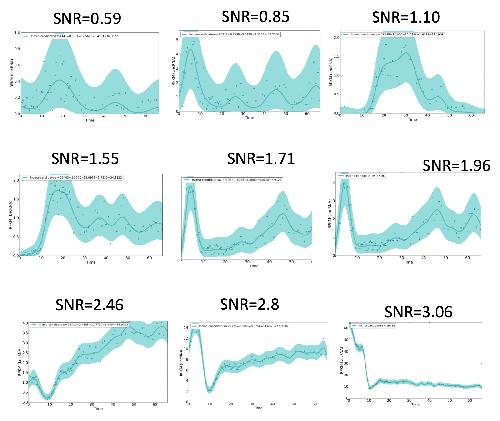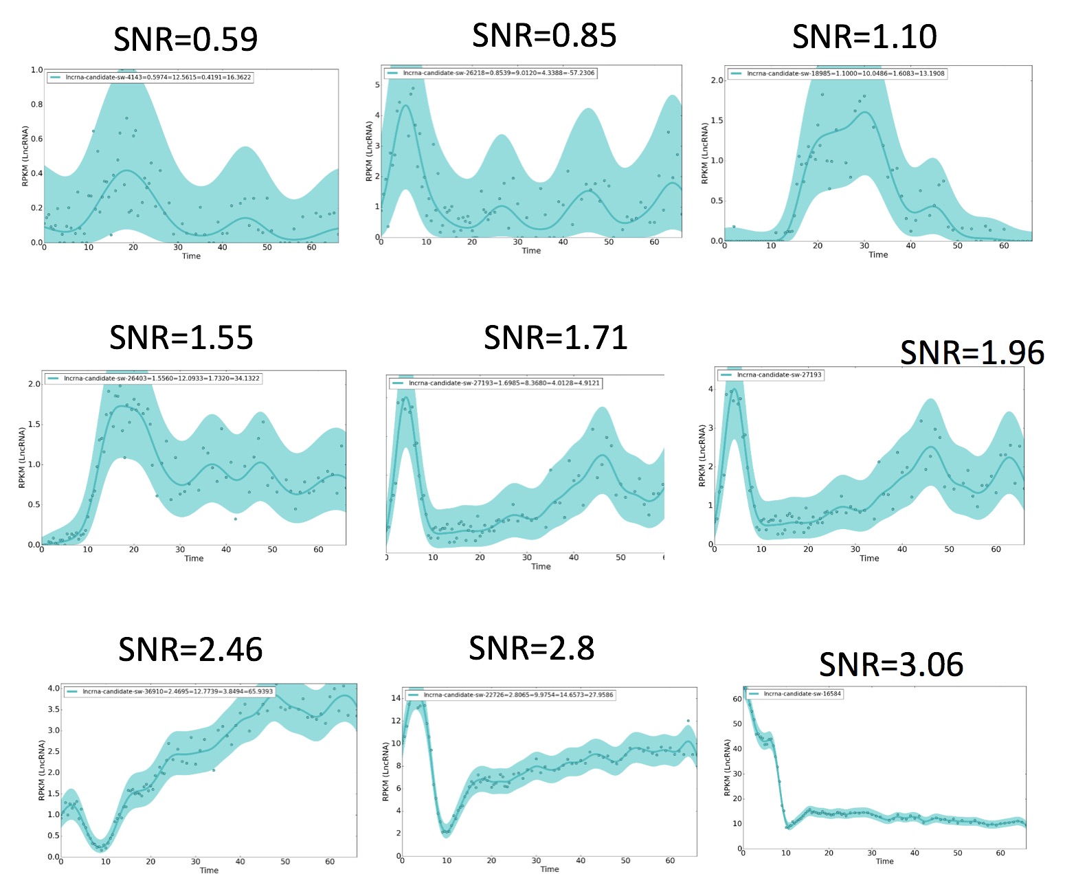 Supplementary Figure 2 Examples of lncRNA gene expression patterns at increasing signals-to-noise ratios (SNRs). We set the threshold SNR to be 0.6 for our pipeline analysis (Figure 1).