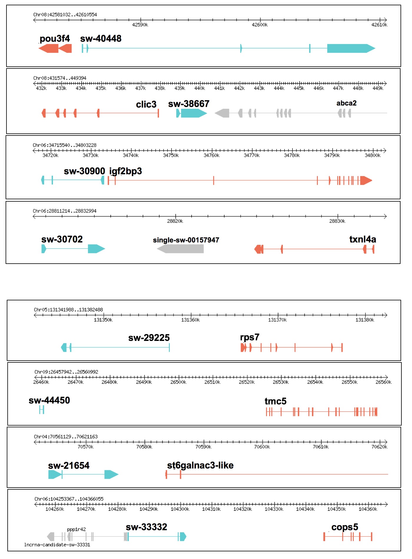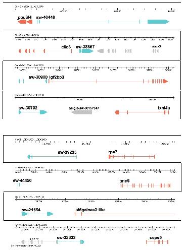 Supplementary Figure 5 Genome browser view of lncRNAs and neighboring genes displayed in Figure 3. Red lines represent coding genes. Blue lines denote lncRNAs. Grey lines feature other nearby coding genes around the lncRNA loci.