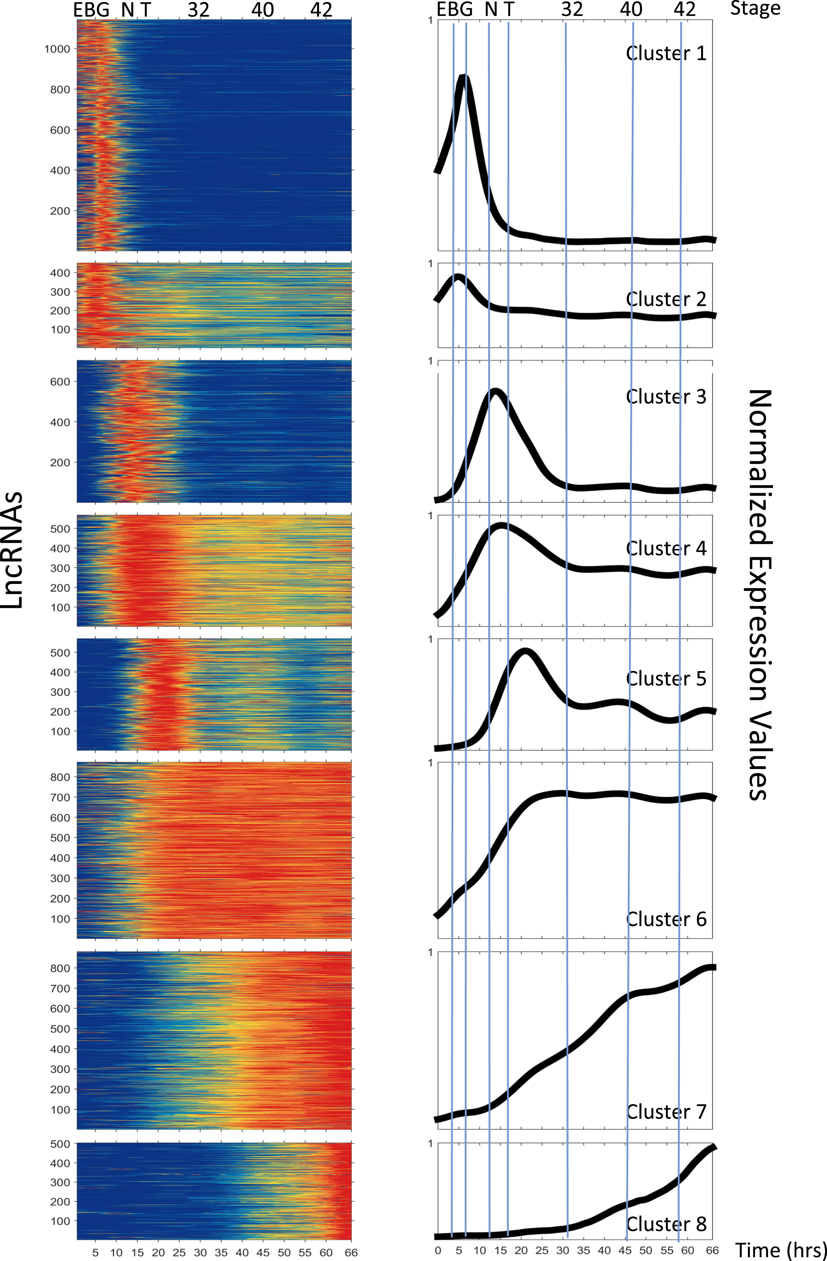 Temporal expression dynamics of lncRNAs. The expression values of individual candidate lncRNAs are normalized by their maxima. These expression profiles are assigned (k-means clustering) to 8 different expression clusters. A) The heatmaps show individual normalized expression patterns for all 5689 lncRNAs. B) The plots demonstrate the average expression of all genes within individual clusters. Each blue bar in panel B corresponds to egg (E), late blastula (B), gastrula (G), neurula (N), tailbud (T).