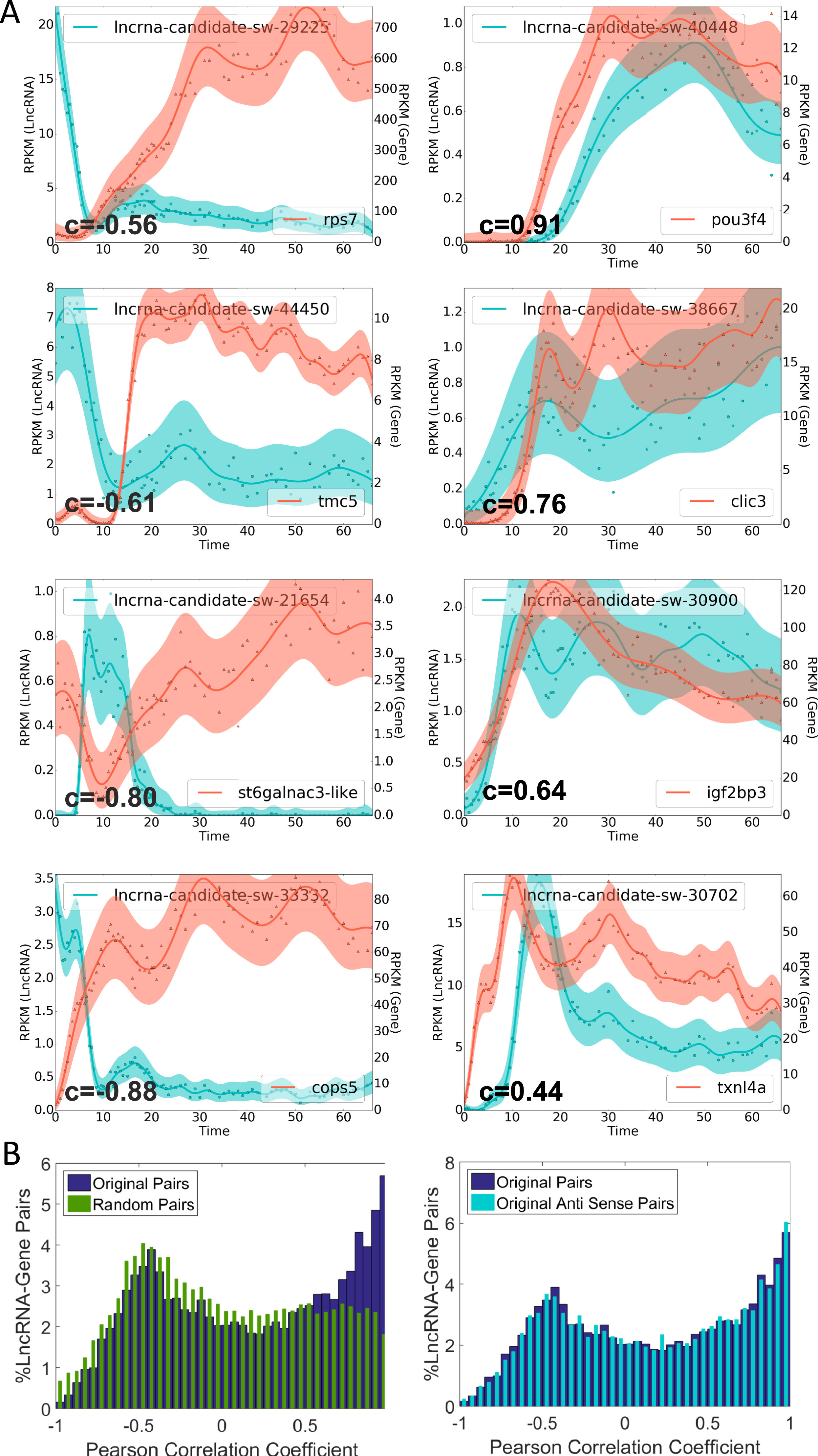 Expression profiles of lncRNAs and the neighboring genes. A) Gene expression values in RPKM are shown for a lncRNA and a neighboring gene during the developmental time course. The blue and red solid lines represent Gaussian processes medians and the shaded areas are the 95% confidence intervals of the data. C denotes the Pearson correlation between the lncRNA and neighboring gene expression dynamics. Gene models of lncRNAs are shown in Supplementary Fig. 5. B) Left panel shows distribution of correlations of pairs of lncRNA – neighboring gene (in blue) and pairs of lncRNA – random gene (green). Right panel shows the distribution of correlations of pairs of lncRNA – neighboring gene (in blue) and pairs of antisense strand lncRNA –neighboring gene (light blue). Pearson coefficient of 1 is highly correlated, and −1 is highly anti-correlated.