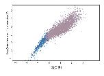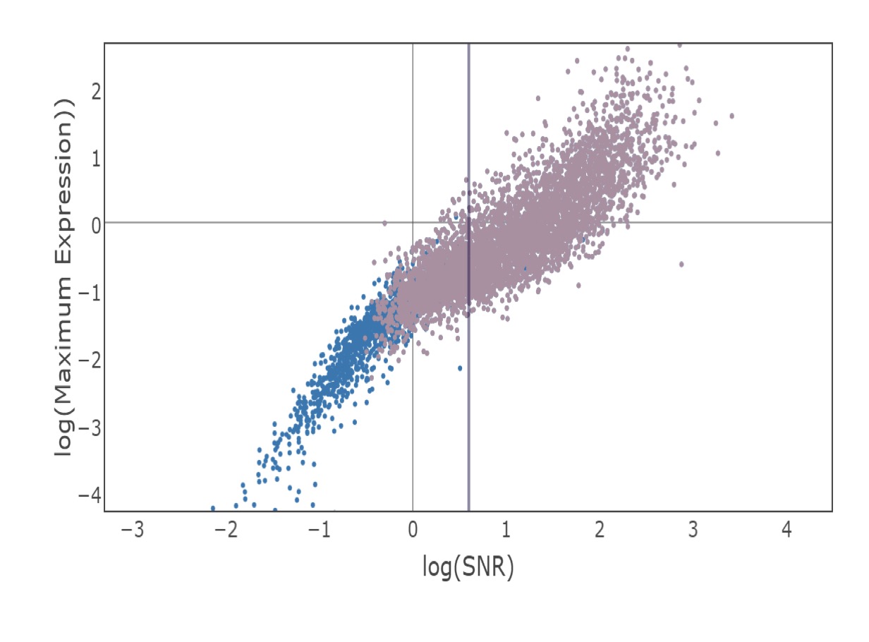 Supplementary Figure 1 Scatter plot of 4640 lncRNA candidates after step 6. X-axis is the log (signal variance/noise variance) calculated using signal variance and noise variance hyperparameters of Gaussian processes. Y-axis is the log of maximum expression value observed for each transcript. The light purple points (2795) have at least 5 consecutive non-zero expression time points and those in blue (1845) failed to satisfy this condition. The vertical line demonstrates log10(SNR)=0.6, which is the threshold we used to eliminate less-qualified transcripts