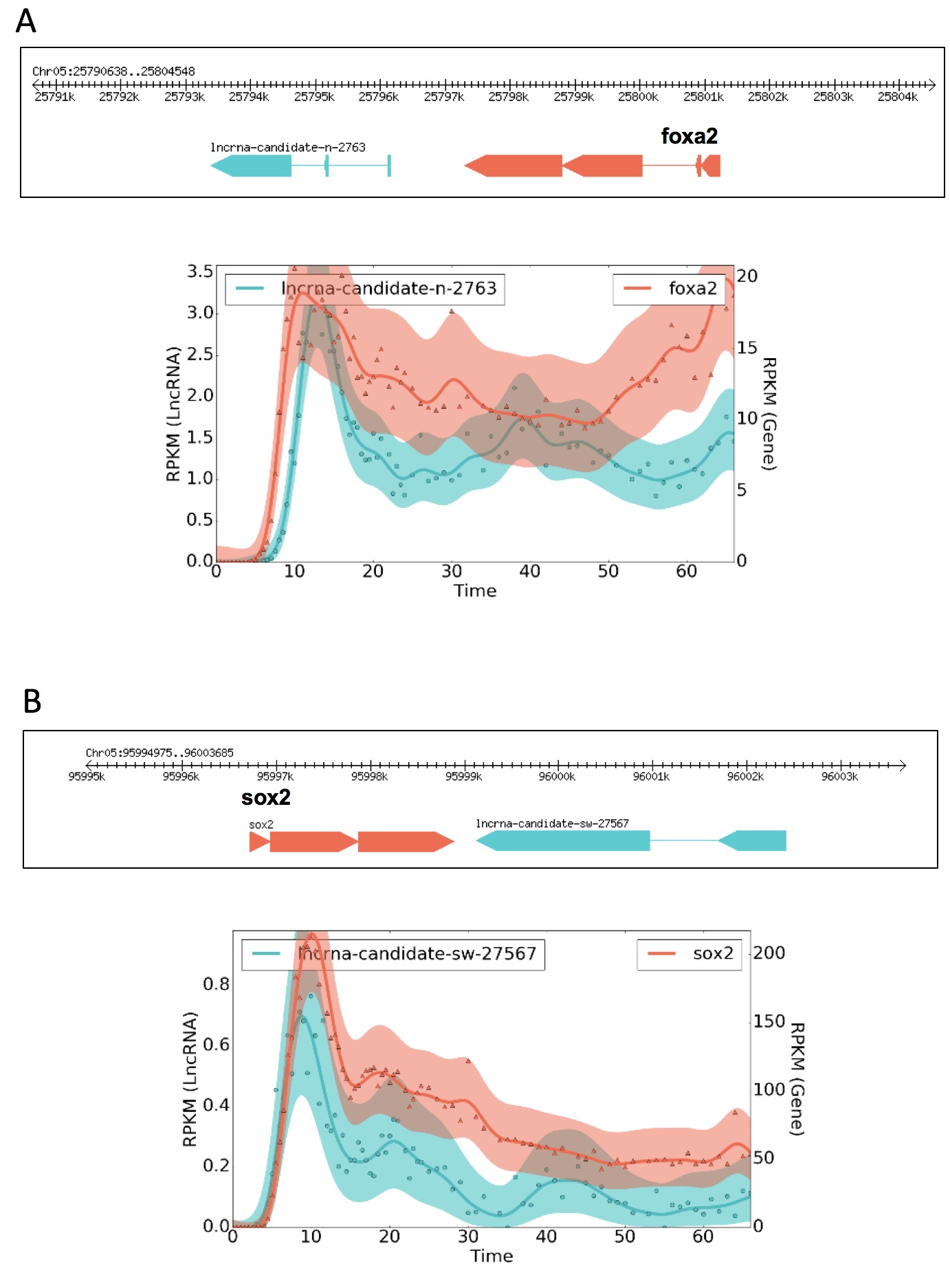 Supplementary Figure 3 Candidate lncRNAs located near foxa2 and sox2 loci. Foxa2 lncRNA did not survive our analysis as one paired end read bridged between this lncRNA and Foxa2 exon. However, we propose that this lncRNA adjacent to FOXA2 is an authentic lncRNA because syntenic lncRNA is found in both human and mouse. We also found lncRNAs adjacent to Sox2 in both human and mouse.