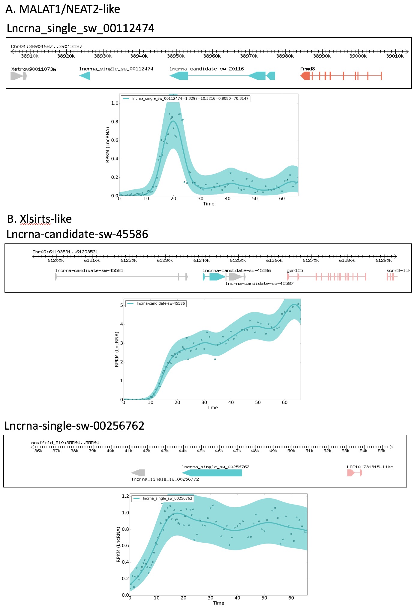Supplementary Figure 4MALAT/NEAT2 and Xlsirts-related lncRNAs in Xenopus tropicalis. A) Besides the sequence similarity between lncrna_single_sw_00112474 and MALAT1 in mouse and human, the relative position of frog malat1 with respect to frmd8 also agrees with that found in mouse and human. In all three species, MALAT1 is a single exon lncRNA gene located downstream of FRMD8. In addition, NEAT1 lncRNA gene is located between MALAT1 and frmd8 in human and mouse, and we find a lncRNA in the similar position in Xenopus tropicalis. B) For Xlsirts, multiple alignments to our set of lncRNAs were reported by Blast, and two examples are shown. Xlsirt-related genes are found between Xenopus tropicalis and laevis, but not in human and mouse.