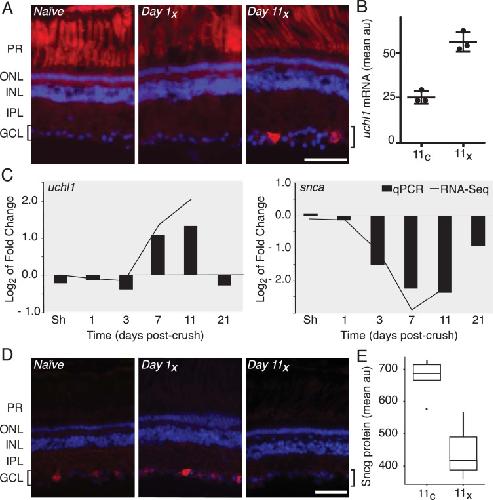 Fig. 3. Independent biological validation of RNA-Seq. The up- and down-regulation of select factors in response to optic nerve injury described in the TRAP RNA-Seq analysis was independently verified by in situ hybridization, RT-qPCR and immunofluorescence. (A) In situ hybridization demonstrates that uchl1 transcript is up-regulated unilaterally in RGCs by 11 days post-injury (Day 11x). Autofluorescence of photoreceptor cells (PR) shows no injury-dependent variability. (B) Semi-quantitative analysis of fluorescence intensity from uchl1 in situ, as shown in panel A, shows a significant up-regulation of uchl1 mRNA in the crushed eye relative to control eye in the RGC layer by day 11 (p <0.01). Results were averaged for three retinal sections from each of three different individuals and data represent arbitrary fluorescence units (au). (C) Gene expression levels assayed using RT-qPCR for uchl1 and snca (bars) are highly correlated with changes in fold gene expression quantified by RNA-Seq (line graph). (D) As predicted by RNA-Seq, protein levels for sncg decrease over the experimental time course in injured RGCs, as seen by immunofluorescence. (E) Semi-quantitative analysis of fluorescence intensity in the RGC layer immunostained for sncg protein, as in panel D, shows strong down-regulation of sncg in crush relative to control eyes by day 11. This boxplot shows averaged results for two retinal sections from each of four different individuals and values represent arbitrary fluorescence units (au). In A and D, location of the RGCs observed in the ganglion cell layer (GCL) and highlighted by brackets, photoreceptor cell (PR) outer (ONL) and inner (INL) nuclear and inner plexiform (IPL) layers was visualized using DAPI. The scale bar is 50 µm.