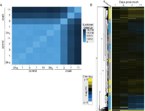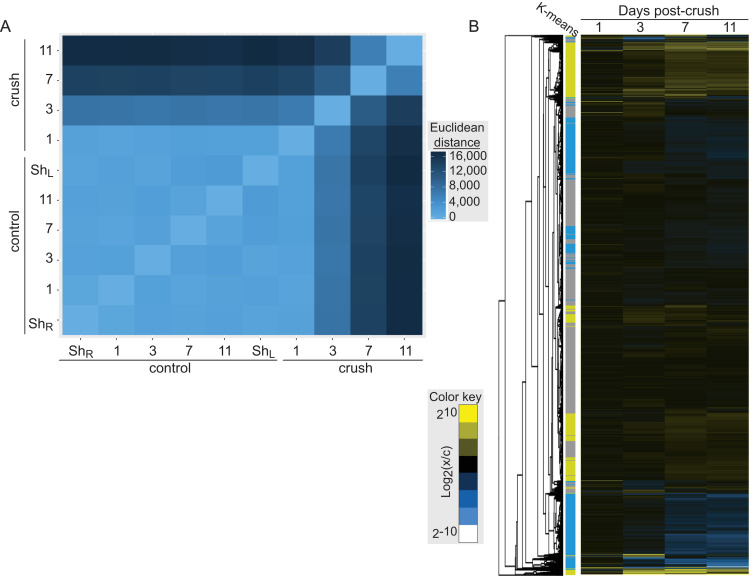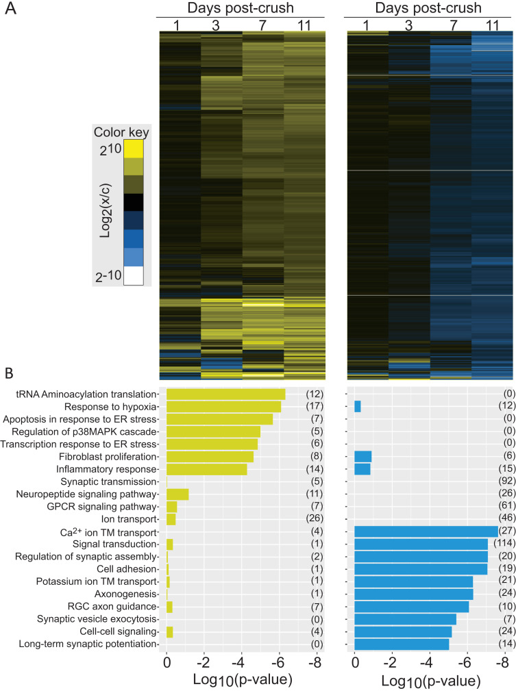 Fig. 5. Functional specificity in the set of transcripts that are up- and down-regulated following retinal ganglion crush. (A) Heat maps showing hierarchical clustering of transcripts that are up- (left) and down-regulated (right), identified by k-means clustering, following retinal ganglion crush. (B) The set of Gene Ontology biological process terms that are significantly over represented in each group of transcripts. The evidence for enrichment of each term (log10(p-value)) is plotted for the group of up- (left) and down-regulated genes (right); there is little overlap in significantly enriched terms.