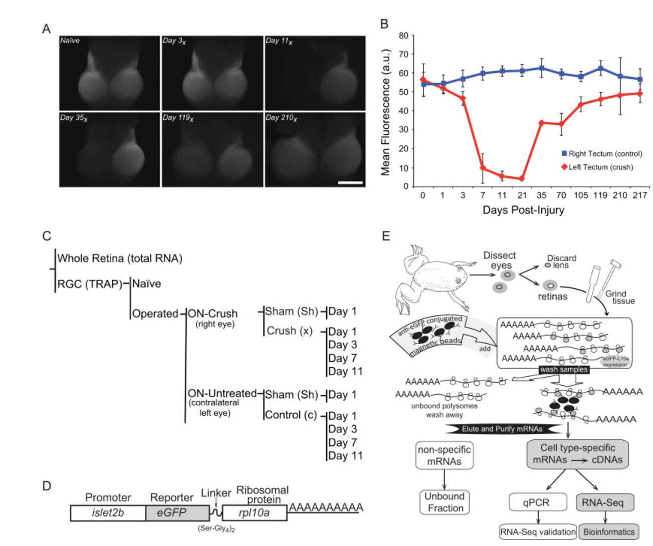 Fig. 1. Profiling retinal ganglion cell regeneration. (A) The effects of axonal injury on retinal ganglion cells (RGCs) in the optic tectum can be visualized using frog lines expressing GFP under the control of an RGC-specific promoter (islet2b). An example time series shows the key transition point falls between 3 and 7 days post-injury, with full recovery occurring by 210 days (210x) post-injury. (B) Quantification of mean GFP fluorescence intensity in the tectum, as seen in panel (A). Data were averaged from at least 5 biological replicates per day and error bars represent the standard deviation from the mean. (C) In this study, gene expression in RGCs is directly compared between a righteye in which the optic nerve has undergone a surgical crush (Crush) to the untreated lefteye of the same animal (Control) for various days after surgery (1, 3, 7, 11). Additional controls include a sham surgery (Sham), non-surgical animals (Naïve), and RNA from whole retina (Total RNA). (D) To allow for tissue specific isolation of ribosome-associated mRNAs from RGCs, a transgenic line of Xenopus laevis is used that expresses an eGFP tagged variant of rpl10a under the control of an RGC-specific promoter (islet2b). (E) Following retina dissection, ribosome-associated RNAs in RGCs are purified using eGFP coated magnetic beads; subsequent poly(A) selection enriches for mRNA species. This mRNA fraction is then used for RT-qPCR validation and RNA-Seq library construction.