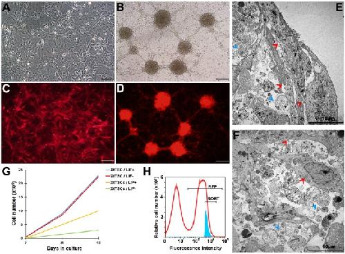 Fig. 1. In vitro characterization of X. tropicalis cell culture. (A,B) Testicular somatic cell culture in morphology of adherent feeder layer (XtTSC) (A) and after long-term cultivation which enables the forming of colonies (XtTSCc) (B). (C) X. tropicalis transgenic XtTSC expressing Katushka RFP under CAG promotor (XtTSC-RFP). (D) Transgenic Katushka RFP expressing XtTSC in colonies (XtTSCc-RFP). (E,F) Structure of in vitro testicular cell colony visualized by TEM. In the colony the cells are placed in an extensive amount of extracellular matrix with two or three tight layers of XtTSCs surrounding the colony at the edge (E). Both XtTSC and XtTSCc are present in the centre of the colony (F). The XtTSCc are clearly several times smaller than the XtTSC. Red arrowheads, XtTSC; blue arrowheads, XtTSCc. (G) X. tropicalis cell culture proliferation during long-term cultivation in medium with or without recombinant mouse LIF. (H) Representative graph of FACS sorting after nucleofection. Only â¼15% of living transgenic cells with the highest intensity of fluorescent signal were sorted (blue area). Scale bars A,C:100â μm; scale bars B,D: 200â μm; scale bars E,F: 10â μm.