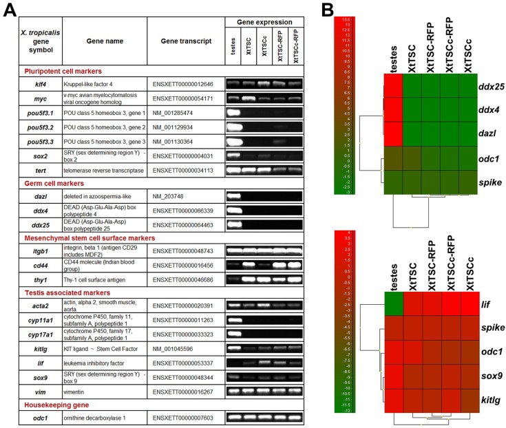Fig. 2. Expression analysis of X. tropicalis testicular culture. (A) RT-PCR analysis of X. tropicalis testis, XtTSC, XtTSCc, XtTSC-RFP and XtTSCc-RFP. (B) Hierarchical clustering presented as a qPCR heatmaps of germ cell markers and selected testis associated markers. A scale of colours indicates level of expression (the highest expression is shown by bright red, whereas the lowest expression is shown by bright green). Similarity between cell types/genes is indicated by the height at which the dendrograms are joined. The RNA spike represents a highly stable transcript across the cell types and odc1 represents housekeeping gene.