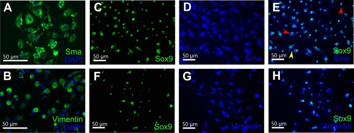 Fig. 3. Immunocytochemistry of X. tropicalis testicular cell culture expressing Katushka RFP. Positive staining for Sma (marker of peritubular myoid cells, green) (A) and vimentin (marker of mesenchymal cells and peritubular myoid cells, green) (B). Nuclei were counterstained with DAPI (blue). (C-E) Double staining with Sox9 (marker of Sertoli cells, green) (C) and Sma (blue) (D) antibodies. (E) Merge of C and D. Yellow arrowhead, cell expressing both antigens; red arrowheads, cells expressing only Sox9 or only Sma. (F-H) Double staining with Sox9 (green) (F) and vimentin (blue) (G) antibodies. (H) Merge of F and G. Scale bars: 50â μm.