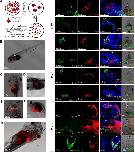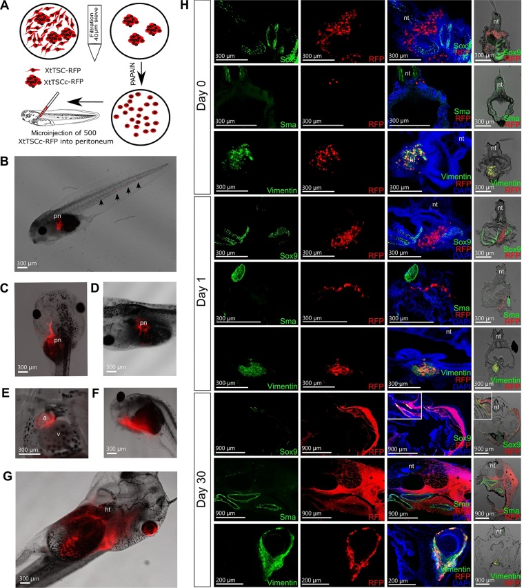 Fig. 5. Migration potential of X. tropicalis testicular somatic cells after allogeneic transplantation into peritoneal cavity of tadpoles in stage 41. (A) Scheme of XtTSCc-RFP preparation prior to transplantation employing isolation of cell colonies using 40â μm sieve and subsequent single cell dissociation with papain. 500 cells were microinjected dorsally into peritoneal cavity. (B-G) Observation of RFP-positive cells in transplanted tadpoles under stereo microscopy. (B) Cell deposit in pronephros and tail 1â day after microinjection. (C,D) Cell deposits in pronephros 13â days after microinjection. (E) Migration of RFP-positive cells into heart atrium 15â days after transplantation. (F,G) Cell-to-cell net growing through the tadpole body observable 30â days after microinjection. (H) Immunohistochemistry of agarose-embedded sections of transplanted tadpoles using antibodies against Sox9, Sma and vimentin (green) and Katushka RFP (red) 0, 1 and 30â days after transplantation. RFP-positive cells were stained with vimentin antibody but not Sox9 or Sma even 2â h after transplantation. 30â days after microinjection, few cells start to express Sox9 indicating potential redifferentiation into Sertoli cells or chondrocytes where Sox9 is considered as a specific marker. The first three figures in each line were taken under fluorescence microscopy. The figures on the right side were taken under fluorescence stereomicroscopy. Nuclei were counterstained with DAPI (blue). Scale bars B-G, H (0 and 1â day after transplantation), 300â μm; scale bars in H (30â days after transplantation, staining with Sox9 and Sma antibodies), 900â μm; scale bars in H (30â days after transplantation, staining with vimentin antibody), 200â μm.