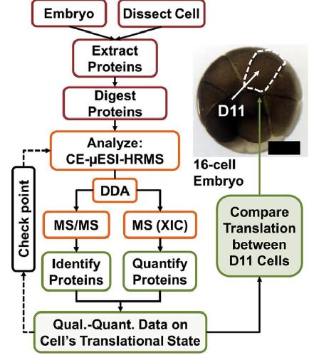 Fig. 1. Flowchart for enabling label-free quantification (LFQ) on limited amounts of tissues and single embryonic cells in the 16-cell frog Xenopus laevis embryo. Check-points serve as feed-back mechanism to aid LFQ sensitivity. LFQ was performed to quantify protein expression between n = 3 midline dorsal-animal (D11) blastomeres, which reproducibly give rise to the nervous system (41). Scale bar = 100um. |