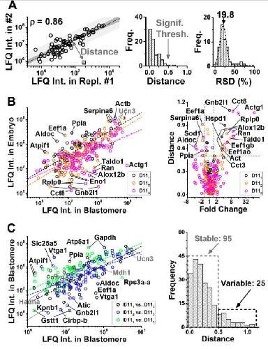 Fig. 5. Correlation analysis for uncovering translational differences between three D11 blastomeres (D111, D112, D113) and the 16-cell embryo. Each data point represents a different protein group. A, LFQ intensities of proteins were reproducibly quantified between technical replicates (D112 shown, left panel), as indicated by high Pearson correlation coefficients (ρ) between the data sets. Prediction band with 95% confidence is shown in gray surrounding the linear fit. For any given protein (see mock protein in gray square), correlation was calculated as the Euclidean distance (d) from the linear fit. Based on the technical reproducibility, a d > 0.5 was considered to mark significant dysregulation in protein abundance (middle panel). LFQ intensities were repeatable with ∼20% relative standard deviation (RSD); therefore, a fold change of ≥1.5 was chosen to mark biological significance (right panel). B, Comparison of protein expression between the D11 cells and the whole 16-cell embryo revealing accumulation for 17 proteins in the cells and eight proteins in the average embryo (left panel). Using correlation distance and median-normalized fold change to query differentially expressed proteins (right panel). C, Correlation analysis also revealed graded translational differences between the D11 blastomeres (left panel). Categorization of protein expresion as stable and variable (see Table II) based on d values (right panel). Key: ρ = 0.72 for D111versus embryo, 0.76 for D112versus embryo, 0.61 for D112versus embryo, 0.61 for D111versus D112, 0.75 for D111versus D113, and 0.73 for D112versus D113. Vitellogenin proteins (LFQ intensity > ∼1 × 109) were excluded from the analysis and are not shown. |