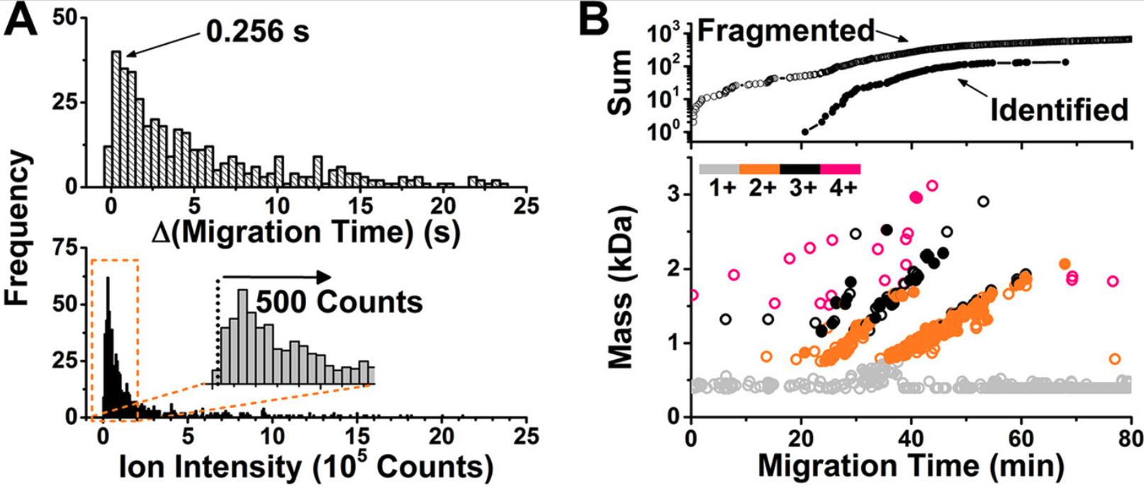 Fig. 3. Sequencing trace-level peptides by CE-HRMS using Qq time-of-flight HRMS.A, Data-dependent tandem MS was tailored to closely migrating (top panel) and low-abundance peptide signals (bottom panel). Key: Δ, separation time difference between consecutively migrating peptides. B, Rate of fragmented molecular features (data in open circles) and identified peptides (data in filled circles) revealing compact separation and electrophoretic migration trends in the mass versus migration time versus charge state domain. Identified proteins are listed in supplemental Table S1B. |