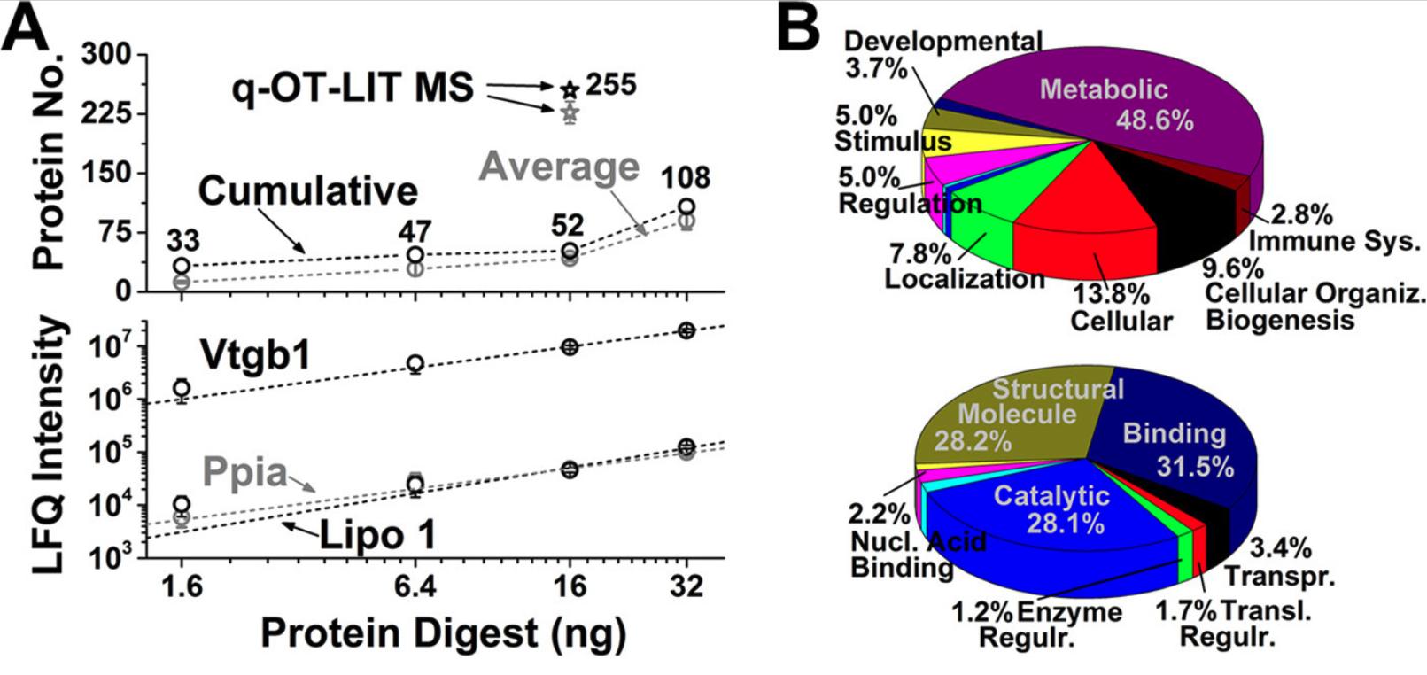 Fig. 4. Identifying and quantifying protein groups in mass-limited specimens.A, Proteins were measured in progressively smaller amounts of digests from whole 16-cell Xenopus embryos using Qq-TOF-MS/MS (top panel). LFQ-based quantification was linear also at the level of proteins (bottom panel), as shown for Vtgb1 (R2 = 0.99), Ppia (R2 = 0.98), and Lipo 1 (R2 = 0.90). Using an orbitrap-quadrupole-linear ion trap (q-OT-LIT) instrument capable of ion trapping, higher-resolution analysis, and parallelization of MS1-MS/MS events, protein identification was enhanced fivefold. Quantified proteins are listed for the Qq-TOF in supplemental Table S1C and q-OT-LIT in supplemental Table S1D. Error bars show S.E.M. B, Gene ontology annotation of biological processes (top panel) and molecular functions (bottom panel) for proteins identified in the 16-cell embryo. |