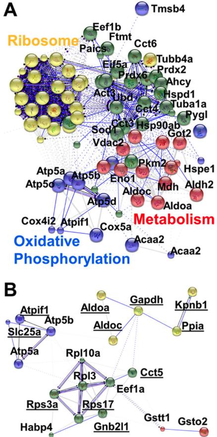 Fig. 6. Protein interaction networks in single D11 blastomeres. Networks were predicted using STRING 10 based on proteins with (A) stable (d <= 0.5) and (B) variable (d > 0.5) abundance between the blastomeres. KEGG functions are labeled for proteins with associations. Among the differentially quantified proteins were many that are known to express in the neural plate, eye, head, nervous tissue, heart, or tail-bud of the embryo (see underlined proteins). An enlarged network is shown for stable proteins in supplemental Fig. S3. STRING parameters: actions view shown; disconnected nodes removed (Atic, Cirbp-p, and Vtga1 in panel B); k-means clustering = 3. |