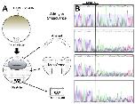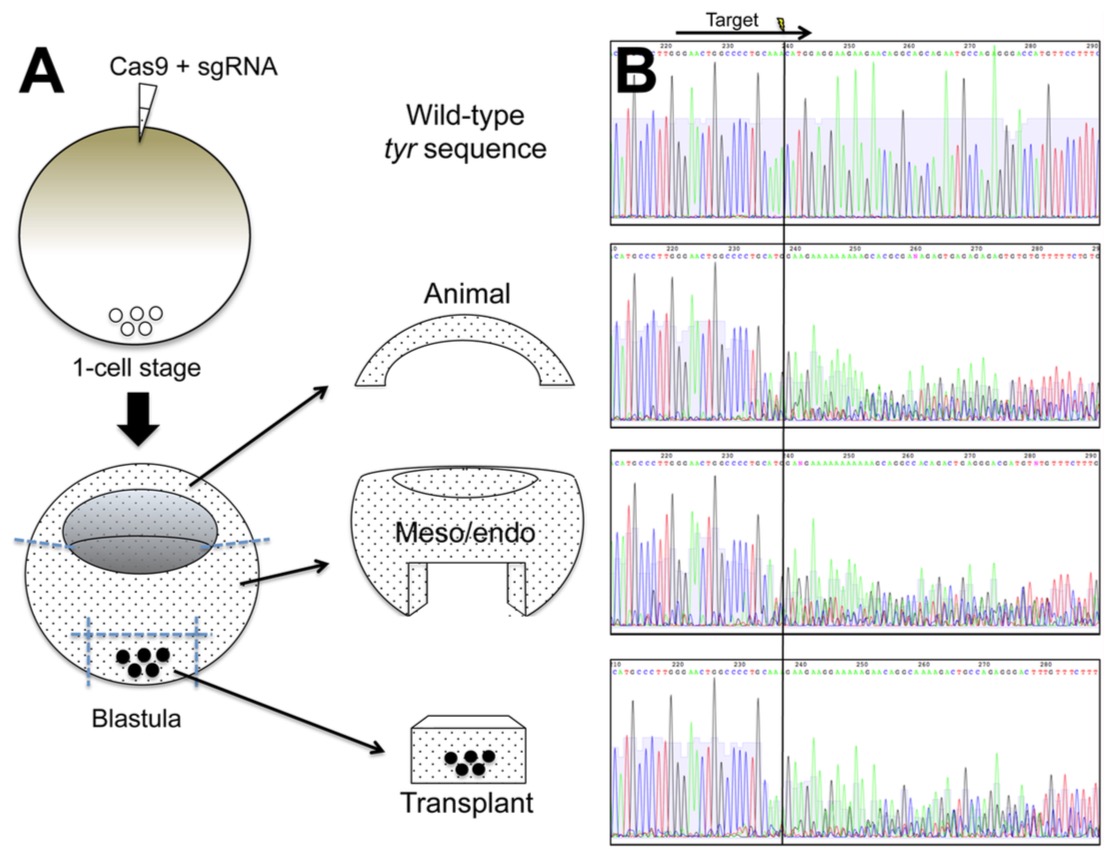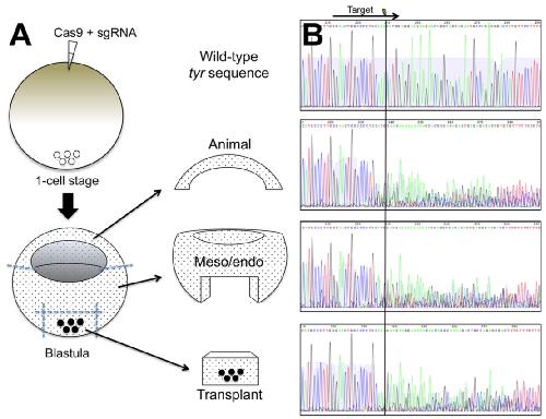 (A) Dissection scheme. Embryos were injected animally at the 1-cell stage with tyr sgRNA-complexed Cas9 protein. At blastula stage 9 they were dissected into animal cap and vegetal PGC transplant regions, and the embryo remainder composed of vegetal and marginal zone tissues (mesoderm and endoderm; Meso/endo). Individual embryo fragments were lysed and the tyr target region was PCR amplified. The amplicon population was subjected to direct sequencing (DSP; Nakayama et al., 2014). (B) DSP assay results are shown for each region from a single embryo. The position of the predicted Cas9 cleavage site is shown as a vertical line. One can see that, in comparison to the sequence profile of an uninjected embryo at top, all three regions from one injected embryo show similar profiles of âmixedâ peaks beginning just upstream of the cleavage site and extending downstream to it. These results suggest that the PGC explant has been successfully mutagenized and that the remainder of the embryo (carcass) can be used as a proxy for the PGCs to determine which embryos carrying leapfrog transplants likely have successfully CRISPR/Cas9 mutated PGCs.