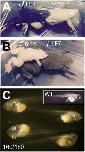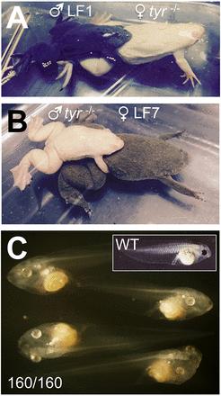 Fig 2. Test crosses between animals carrying tyr-mutated leapfrog transplants and albinos demonstrate germline transmission of mutant alleles. (A) Leapfrog transplant-bearing male (pigmented) is shown amplexed with an albino tyrâ/â female. (B) Leapfrog transplant-bearing female (pigmented) is shown amplexed with an albino tyrâ/â male. (C) Examples of F1 progeny from the cross in A grown to tadpole stage. These tadpoles are albino because they inherited tyr mutant alleles from both F0 parents. Therefore the leapfrog-generated frog carries gametes derived from CRISPR-mutated PGCs. The inset in C shows an unrelated pigmented tadpole at roughly the same stage for comparison.