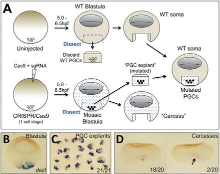 Fig. 1. Transplantation of PGCs. (A) Scheme for transplanting PGCs from CRISPR/Cas9-mutagenized blastula stage embryos (bottom) into a wild-type soma (top) that has had its PGCs removed. (B) Wild-type blastula showing vegetal localization of PGCs as detected by dazl in situ hybridization. (C) PGC explants show many foci of dazl expression. (D) Carcasses from blastula embryos show vastly reduced dazl expression foci, suggesting effective removal of PGCs.