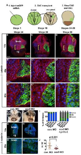 Figure 3. EAD Ectoderm Undergoes Convergent Extension as the Cranial Neural Crest Approaches the Midline and EAD Convergent Extension Fails to Occur in sox9 LOF Embryos (A) Experimental schematic. (BâDâ²) Coronal sections with mGFP-labeled NC (green) and β-catenin (red) immunolabeling from late neurula (stage 24) to late tailbud (stage 28) (two independent experiments; stage 24, n = 7; stage 26, n = 7; stage 28, n = 4). Midline region (bracket) with bright β-catenin labeling is EAD ectoderm. Bracket: region of 10à image (BâD) enlarged in 40à view (Bâ²âDâ²) and 63à view (Bâ²â²âDâ²â²). cg, cement gland. (E and F) Frontal view of control and sox9 LOF embryos at swimming tadpole (stage 40) assayed in two experiments (control MO in E, n = 24; sox9 MO in F, n = 30.) Dots surround open mouth. Bracket: unopened mouth. Scale bar, 200 μm. (GâHâ²) Coronal sections assayed in four independent experiments (n = 23) with β-catenin immunolabeling and Hoechst nuclear labeling. Midline region with bright β-catenin labeling is EAD ectoderm. Bracket: region of 10à image (G and H) enlarged in 25à view (Gâ² and Hâ²). cg, cement gland. (I) Graph depicting percent of embryos displaying face, mouth, nostril, and pigment formation phenotypes at stage 40 in control and sox9 LOF embryos. p values were obtained from Fisherâs exact probability test. (J) Quantification of height over width of EAD (see Experimental Procedures). p values were obtained from unpaired, two-tailed t tests. Error bar represents SD. Unless otherwise specified, scale bars represent 170 μm (10Ã), 68 μm (25Ã), 43 μm (40Ã), and 27 μm (63Ã). |