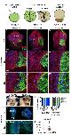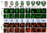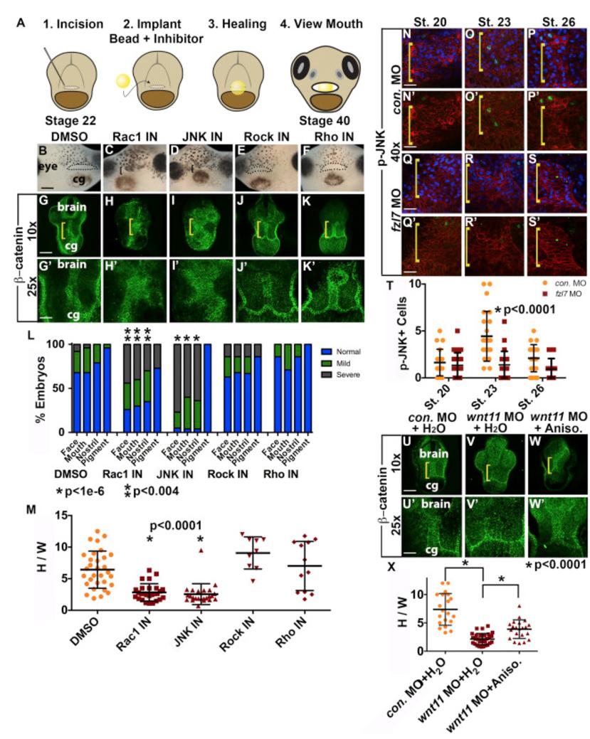 Figure 5. Inhibition of GTPases JNK and Rac1 Is Associated with a Reduction in EAD Ectodermal Convergent Extension (A) Experimental schematic of inhibitor loaded bead implantation in the presumptive mouth, EAD region. (BâF) Frontal view of swimming tadpole (stage 40) embryos with inhibitor loaded beads implanted in presumptive mouths, assayed in three experiments. (B) Control DMSO (n = 97). (C) Rac1 (n = 40). (D) JNK inhibitor (n = 44). (E) Rock inhibitor (n = 75). (F) Rho inhibitor (n = 39). Bracket: unopened mouth. Dots surround open mouths. cg, cement gland. Scale bar, 200 μm. (G-Kâ²) Coronal sections, stage 28, assayed in 3 independent experiments. (G and Gâ²) Control DMSO (n = 31). (H and Hâ²) Rac1 inhibitor (n = 27). (I and Iâ²) JNK inhibitor (n = 24). (J and Jâ²) Rock inhibitor (n = 9). (K and Kâ²) Rho inhibitor (n = 12) with β-catenin immunolabeling. Midline region with bright β-catenin labeling is EAD ectoderm. Bracket: region of 10à image (GâK) enlarged in 25à view (Gâ²âKâ²). Scale bars represent 170 μm (10Ã) and 68 μm (25Ã). (L) Graph depicting percentage of embryos, displaying face, mouth, nostril, and pigment formation phenotypes at stage 40. p values are from Fisherâs exact probability test. (M) Quantification of height over width of EAD (see Experimental Procedures). p values are from unpaired, two-tailed t tests. Error bar represents SD. (NâSâ²) Control and fzl7 LOF embryos at stage 20 (N and Nâ², n = 19; Q and Qâ², n = 26), stage 23 (O and Oâ², n = 23; R and Râ², n = 23), and stage 26 (P and Pâ², n = 21; S and Sâ², n = 16) with p-JNK immunolabeling (green), mApple cell membranes (red), and Hoechst nuclear counterstain (blue in NâS) assayed in two experiments. Bracket: EAD. Scale bars (40Ã), 43 μm. (T) Quantification of cells with p-JNK positive nuclei in the EAD ectoderm. The total number of EAD nuclei was equivalent between stage-matched control and fzl7 LOF embryos. p < 0.0006, control stage 23 compared to stages 20 and 26. p values were obtained from unpaired, two-tailed t tests. (UâWâ²) Coronal sections, stage 28, assayed in two independent experiments. (U and Uâ²) Control water (n = 20). (V and Vâ²) wnt11 MO + control water (n = 30). (W and Wâ²) wnt11 MO + anisomycin JNK activator (n = 21) with β-catenin immunolabeling. Midline region with bright β-catenin labeling is EAD ectoderm. Bracket: region of 10à image (UâW) enlarged in 25à view (Uâ² âWâ²). Scale bars represent 170 μm (10Ã) and 68 μm (25Ã). (X) Quantification of height over width of EAD (see Experimental Procedures). Error bar represents SD. p values are from unpaired, two-tailed t tests. |