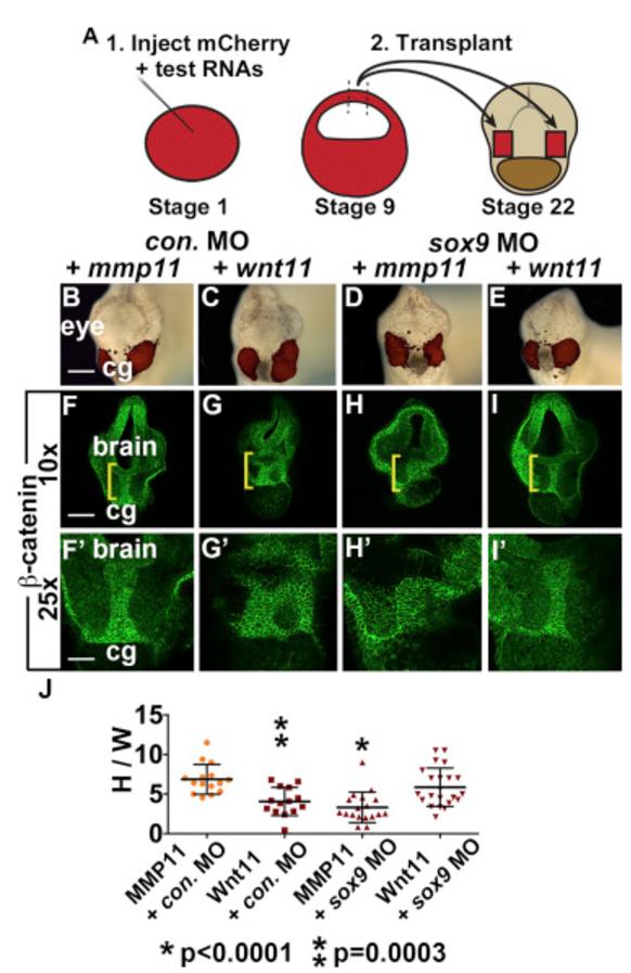 Figure 6. Wnt11 Is Sufficient for EAD Ectoderm Convergent Extension (A) Sufficiency of Wnt11 for midline convergent extension (CE) was tested with an animal cap transplant technique. Experimental schematic of bilateral transplants with mApple, animal cap overexpressing Wnt11 or a control, secreted protein (inactive MMP11). (BâE) Overlay of bright-field images with mApple fluorescence indicating location of donor transplant in late tailbud recipients (stage 28). Scale bar, 200 μm. (FâIâ²) Coronal sections of animal cap transplants with mmp11 or wnt11 overexpressing donor tissue assayed in three experiments with β-catenin immunolabeling. (F, Fâ²) Control MO + mmp11 (n = 15). (G and Gâ²) Control MO + wnt11 (n = 14). (H and Hâ²) sox9 MO + mmp11 (n = 18). (I and Iâ²) sox9 MO + wnt11 (n = 22). Midline region with bright β-catenin labeling is EAD ectoderm. Bracket: region of 10à image (FâI) enlarged in 25à view (Fâ² âIâ²). (J) Quantification of height over width of EAD (see Experimental Procedures). p values are from unpaired, two-tailed t tests. Error bar represents SD. Unless otherwise specified, scale bars represent 170 μm (10Ã) and 68 μm (25Ã). |