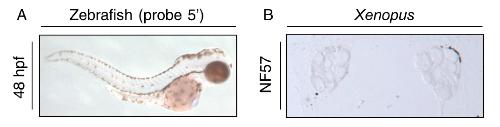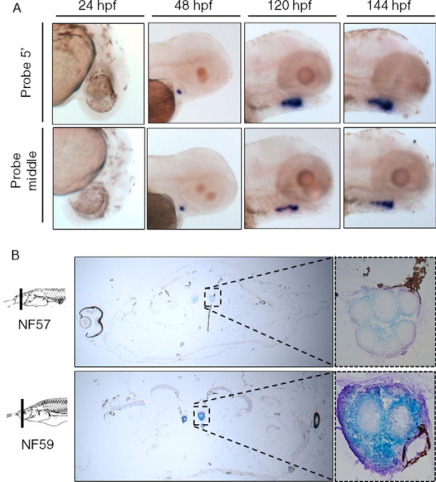 FIGURE 2.. Expression of Tg in zebrafish and Xenopus revealed by ISH. A, for zebrafish embryo experiments, two probes were used, in the 5′ part of the Tg (upper panel) and in the middle (lower panel). ISH were performed at 24, 48, 120, and 144 hpf as indicated. In situ labeling appears in purple. B, for Xenopus tadpole sections, probes were used at stage NF57 and NF59 according to the Nieuwkoop and Faber's classification (73). In situ labeling appears in blue. Negative controls with sense probe show no staining (supplemental Fig. S1).