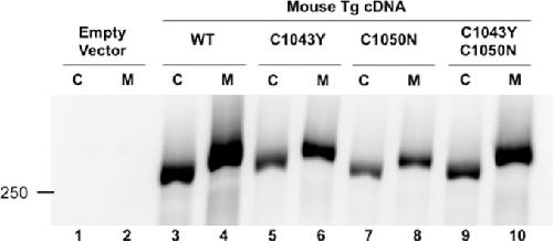 FIGURE 4.. Role of the Tg1–8 repeat in the secretion of Tg. Cysteines forming the second disulfide bond of Tg repeat 1–8 were mutated individually or in a pair within mouse Tg. Both cell lysates (C) and media (M) were analyzed by SDS-PAGE and Western blotting with a polyclonal anti rodent Tg antibody. Neither the single mutations (lanes 5 and 6 and lanes 7 and 8) nor the double mutation (lanes 9 and 10) block expression or the secretion of the Tg protein.