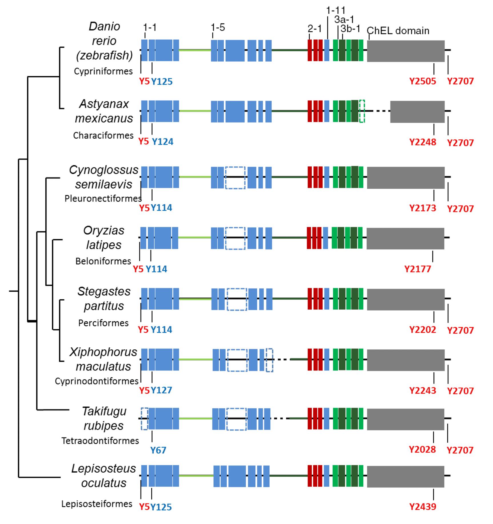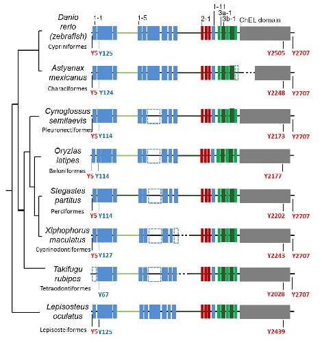 FIGURE 6.. Prototypic vertebrate thyroglobulin. Vertebrate common features are shown: Tg1 repeats are shown in blue boxes, Tg2 repeats are in red boxes, Tg3 repeat is green boxes, and ChEL domain is by gray boxes. The linker and the hinge are represented by a light green and dark green line, respectively. The main hormonogenic tyrosines found in the investigated vertebrate species are represented with their positions in human numbering.