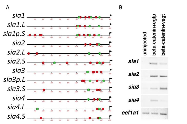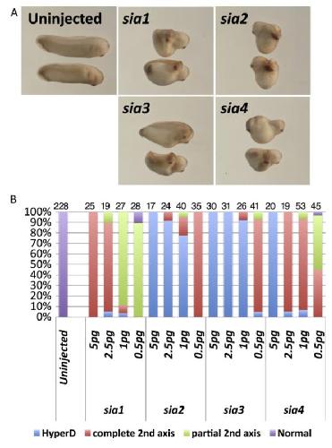 Activity of X. laevis siamois-related genes. Seven X. laevis siamois-related genes (sia1. L, sia2. L, sia4. L, sia1p. S, sia2. S, sia3. S, and sia4. S) were over-expressed with total amounts of 0.5, 1, 2.5 and 5 pg mRNA, (100 and 1000 pg for sia1p. S) into ventral-vegetal cells of X. laevis embryos at 4â8-cell stages. (A) Representative embryos injected with 5 pg mRNA of each siamois-related gene. (B) The percentage of embryos in which a secondary axis was observed after injection of mRNAs of siamois-related genes. The number of embryos analyzed is shown above each bar. sia1p. S has no activity. All siamois-related genes in X. laevis except for sia1p. S induced a complete secondary axis.