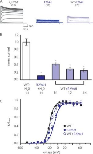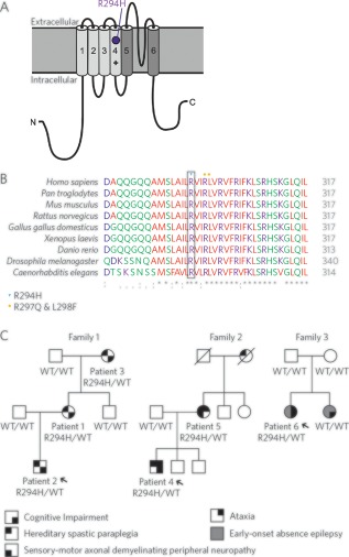 Figure 1. (A) Structure of the voltage‐gated potassium channel, Kv1.2, with transmembrane segments S1 to S4 forming the voltage sensor domain (light gray) and segments S5 and S6 forming the pore region (dark gray) with its pore‐forming loop and location of p.R294H mutation, within transmembrane segment S4, which constitutes the voltage sensor. (B) Evolutionary conservation of R294 amino acid residue and neighboring R297 and L298, which have been implicated in epileptic encephalopathies. (C) Pedigrees of all three families with identified p.R294H mutations along with cosegregation data. WT = wild type. [Color figure can be viewed in the online issue, which is available at www.annalsofneurology.org.]
