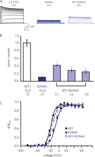 Figure 2. Functional effects of the p.R294H KCNA2 mutation. (A) Recordings of currents elicited by increasing voltage steps from a holding potential of –80mV from Xenopus laevis oocytes expressing either WT KV1.2 channels (left), R294H mutant channels (center), or both (right). (B) Amplitudes of recorded currents normalized to the mean current amplitude of the WT. Amplitudes decreased with increasing amounts of injected mutant cRNA, whereas the amount of WT cRNA remained constant, suggesting a dominant‐negative effect on WT channels. Groups were statistically different (one‐way ANOVA: p < 0.001; post‐hoc Dunn's method: p < 0.05). Shown are means ± SEM. (C) Activation curves of WT, R294H mutant, and a 1:1 expression of both clones, showing a significantly different shift to more‐depolarized potentials for mutant channels, consistent with a loss‐of‐channel function (one‐way ANOVA: p < 0.001; post‐hoc Dunn's method: p < 0.05). Shown are means ± SEM. Lines represent Boltzmann functions fit to data points. ANOVA = analysis of variance; cRNA = complementary RNA; SEM = standard error of the mean; WT = wild type. [Color figure can be viewed in the online issue, which is available at www.annalsofneurology.org.]