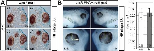 Fig. S3. (A) a1âa4 show a series of transversal sections at the level of the eye of the mid1 injected tadpole (NF stage 38) shown in Fig. 1 A, a. (B) Rescue of the mid1 knockdown eye phenotype. Lateral view of NF stage 38 embryos injected with mid1-mo2 (1.25 pmol) along with synthetic human mid1 RNA (1â2 ng) into one cell of a 2-cell stage embryo. The lower panel shows a 10Ã enlarged view of the respective eye region. Considering the eye to be an oblate spheroid, the mean radius was estimated by measuring the drawn distances and total volume was calculated. The graph shows the mean values for 20 embryos. The specificity of the pax2 and pax6 morpholino had been tested already by rescue experiments in refs. 53 and 54, respectively. |