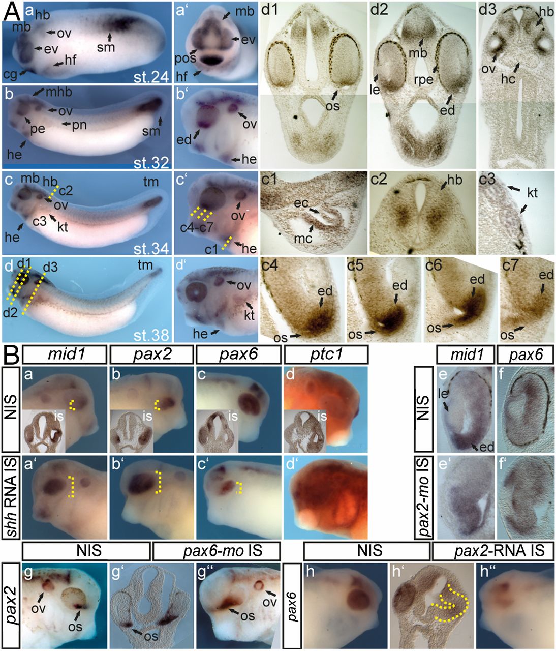 Fig. 1. Mid1 is expressed in cells of the forming optic stalk and induced on shh RNA injection. (A) mid1 mRNA expression was assessed by Wmish on Xenopus laevis embryos at different NF stages. (aâd) Lateral view, (aâ²) cranial view, and (bâ²âdâ²) lateral view. Twenty-micrometer gelatin/albumin sections at the level of the tadpoleâs head (d1âd3), heart (c1), neural tube (c2), and pronephric anlage (c3). cg, cement gland; ec, endocardium; ed, eye disk; ev, eye vesicle; hd, hindbrain; he, heart; hf, heart field; kt, kidney tubules; mb, midbrain; mc, myocardium; op, olfactory placode; os, optic stalk; ov, otic vesicle; pnt, pronephric tubule; pos, presumptive os; sm, somites. (c4âc7) mid1 expression in eye stalk region in serial sections. (B) Injections were done into one cell of two-cell stage embryos. (aâdâ²) Synthetic shh-RNA (500 pg) was injected and Wmish against mid1, pax2, pax6, and ptc1 was performed as indicated. (eâfâ²) pax2-mo (2.5 pmol) was injected, and expression of mid1 and pax6 was monitored. Shown are transversal sections of the eye at the level of the lens. (gâgâ²) pax6-mo (2.5 pmol) was injected, and pax2 was monitored. Shown are lateral views of the head region and a transversal section of the head region at the level of the optic vesicles (gâ²). (hâhâ²) pax2 RNA (100 pg) was injected and expression of pax6 was analyzed. |