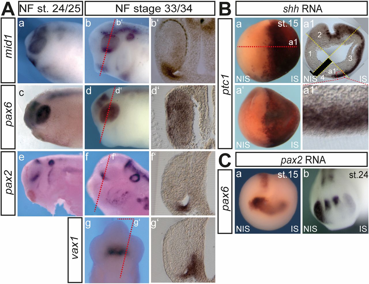 Fig. S1. (A) aâf, Lateral view of the head region; g, ventral view of the head region; bâ²âgâ², sections at the level of the forming eye stalk as indicated by the red dashed lines. Though pax2, vax1, and mid1 are clearly expressed within the forming eye stalk, their pattern of expression in this part is not identical and appears to follow a proximodistal axis with mid1 more distally, pax2 centrally, and vax1 proximally located. (B) a, dorsal view; aâ², anterior view; a1, transversal section as indicated in a. The misexpression of shh upon the microinjection of synthetic 500 pg shh RNA induced the expression of ptc1 strongly at the open neural tube stage (NF stage 15) within the sensorial layer of the ectoderm (a1â²) and this induction of ptc1 is maintained though less intense at tadpole stage (see also Fig. 1 B, dâdâ²). (C) a and b, anterior view. Misexpression of pax2 upon the microinjection of synthetic 100 pg pax2 RNA repressed the expression of pax6 already at the open neural tube stage (NF stage 15) and this suppression of pax6 is maintained at tadpole stage (see also Fig. 1 B, hâhâ²). |