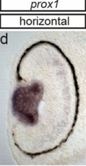 prox1 (prospero homeobox 1 ) gene expression in the sectioned eye of X. laevis embryo, assayed via in-situ hybridization, NF stage 42. |