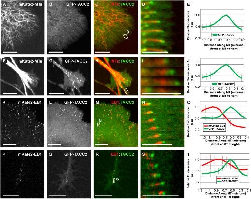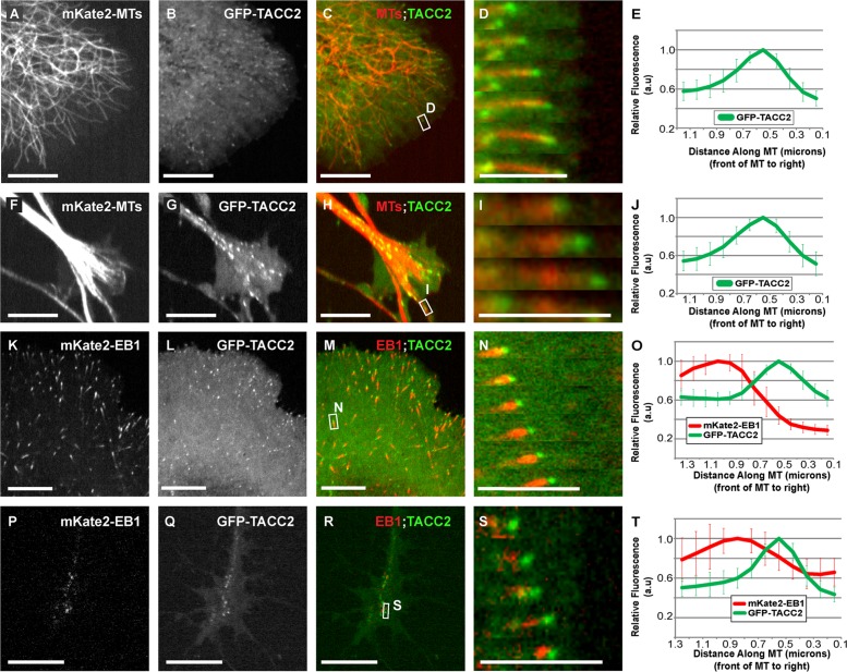 FIGURE 1:. TACC2 can act as a +TIP that localizes in front of EB1 in many embryonic cell types. (AâJ) Representative images of mKate2-tubulin, GFP-TACC2, and merged in cultured embryonic mesenchymal cells derived from neural tube (AâC) and neuronal growth cone (FâH). See Supplemental Movies S1 and S2. (D, I) Magnified time-lapse montage of the boxed regions in C and H. The time interval between frames is â¼2â3 s. (E, J) Fluorescence intensity profile of GFP-TACC2. (KâT) Images of mKate2-EB1, GFP-TACC2, and merged in cultured embryonic mesenchymal cell (KâM) and neuronal growth cone (PâR). See Supplemental Movie S3. (N, S) Magnified time-lapse montage of the boxed region in M and R. For N, the green channel was translated left by â¼0.2 μm to account for the different acquisition times of the red and green channels (MT plus-end velocity â¼0.24 μm/s in this series, and the green channel was imaged 600 ms after the red channel). This allows for a more accurate visualization of +TIP colocalization. For S, the green channel was translated left by â¼0.1 μm (plus end was moving at 0.085 μm/s, and the green channel was imaged 600 ms after the red channel). For all fluorescence intensity profiles, â¼20 MTs for each condition were quantified by intensity line scans. The MT plus end is toward the right, and error bars represent SDs. Scale bars, 5 μm (montages), 10 μm (all others). |