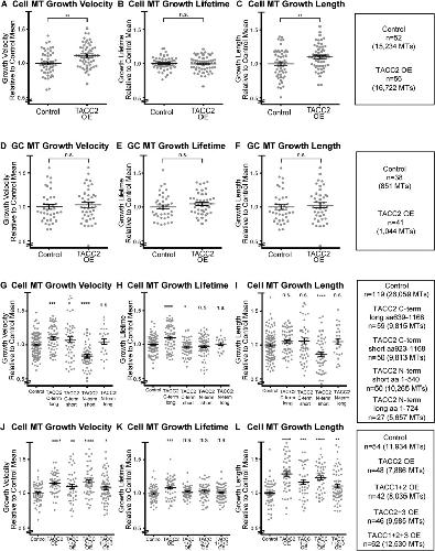 FIGURE 3:. TACC2 can regulate microtubule plus-end dynamics through its C-terminal domain in a cell typeâspecific manner. All raw data of automated tracking of mKate2-EB1 comets were normalized to the same-day control means, and all reported values are relative ones combined over at least three separate experiments. (AâC) Quantification of mean values of MT parameters (velocity, lifetime, length) upon TACC2 OE in embryonic mesenchymal cells. (DâF) MT parameters in growth cones (GC). (GâI) MT parameters in mesenchymal cells on overexpression of C- or N-terminal-truncated TACC2. (JâL) Quantification of MT parameters in mesenchymal cells when multiple combinations of TACC family members were expressed. Bars on dot plots show mean and SEM. To assess statistical significance, ANOVA tests were first performed (for multiple conditions), followed by an unpaired t test. ****p < 0.0001, ***p < 0.001, **p < 0.01, *p < 0.05, n.s., not significant. |