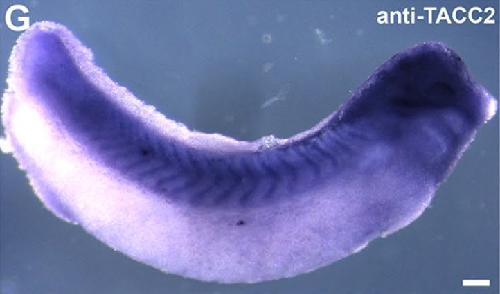 tacc2 (transforming, acidic coiled-coil containing protein 2) gene expression in Xenopus laevis embryo, assayed via in situ hybridization, NF stage 34, lateral view, anterior right, dorsal up. |