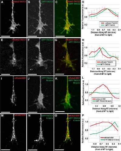 FIGURE 2:. TACC2 localizes to the plus end through its C-terminal domain and overlaps with both TACC1 and TACC3. (AâC) Representative images of mKate2-TACC3, GFP-TACC2, and merged in cultured neuronal growth cones. (D) Fluorescence intensity profiles of GFP-TACC2 and mKate2-TACC3. (EâG) mKate2-TACC1, GFP-TACC2, and merge with GFP-TACC2 fluorescence intensity plot profile (H). (IâK) Images of mKate2-EB1, GFP-TACC2 N-term (aa 1â540), and merged with the plot of fluorescence intensity profiles (L). (MâO) Images of mKate2-EB1, GFP-TACC2 C-term (aa 923-1168), and merged with the plot showing their fluorescence intensity profiles (P). Arrow in N points to lattice binding of TACC protein. Time interval between all frames is â¼2 s. For D, the green plot profile was translated â¼0.2 μm left (MT plus-end velocity â¼0.124 μm/s, green channel imaged 1.5 s after red) to accurately represent relative localization. For H, the green profile was translated left based on the velocity of each comet measured to account for difference in acquisition time points between channels (green channel imaged 1.5 s after red). In P, the green profile was translated 0.1 μm (MT plus-end velocity â¼0.148 μm/s, red channel imaged 0.96 s after green). For all fluorescence intensity profiles, â¼10 MTs for each condition were quantified by intensity line scans, and SDs are shown in error bars. MT plus end is at the right. Scale bars, 10 μm. |