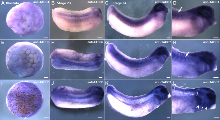 FIGURE 4:. TACC family members are differentially expressed during embryonic development. Cell typeâspecific expression of TACC mRNAs shown by whole-mount in situ hybridization using full-length antisense probes to TACC1, TACC2, and TACC3. TACC1 is expressed uniformly at the late blastula stage (A), in somites, neural tube, and hindbrain at stage 23 (B), and in somites, eye, and anterior neural tube at stage 34 (C, D). TACC2 expression is similar to that of TACC1 at the blastula stage (E) and also increases in a tissue-specific manner after neurulation, apparent in the neural tube, early brain, and presomitic mesoderm at stage 23 (F). At stage 34, TACC2 is expressed in the somitic mesoderm, the ocular lens, and the anterior neural tube (G, H). Arrows in D and H indicate somitic mesoderm. TACC3 expression resembles that of TACC1 and TACC2 at the blastula stage (I), but its expression becomes more neural specific by stage 23, showing expression along the entire length of the neural tube, although strongest anteriorly near the brain (J). At stage 34, TACC3 is strongly expressed in the pharyngeal arches (L, arrows), otic vesicle, and trunk neural crest (K, L). Neural tube and trunk neural crest are indicated by the box in L. Scale bars, 150 μm. |