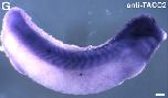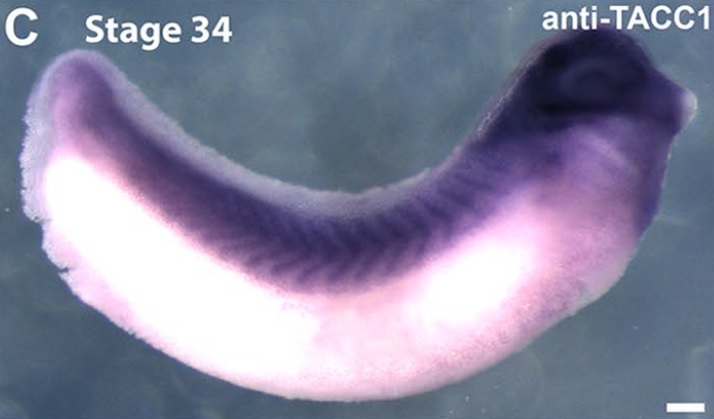 tacc1 (transforming, acidic coiled-coil containing protein 1 ) gene expression in Xenopus laevis embryo, assayed via in situ hybridization, NF stage 34, lateral view, anterior right, dorsal up. |