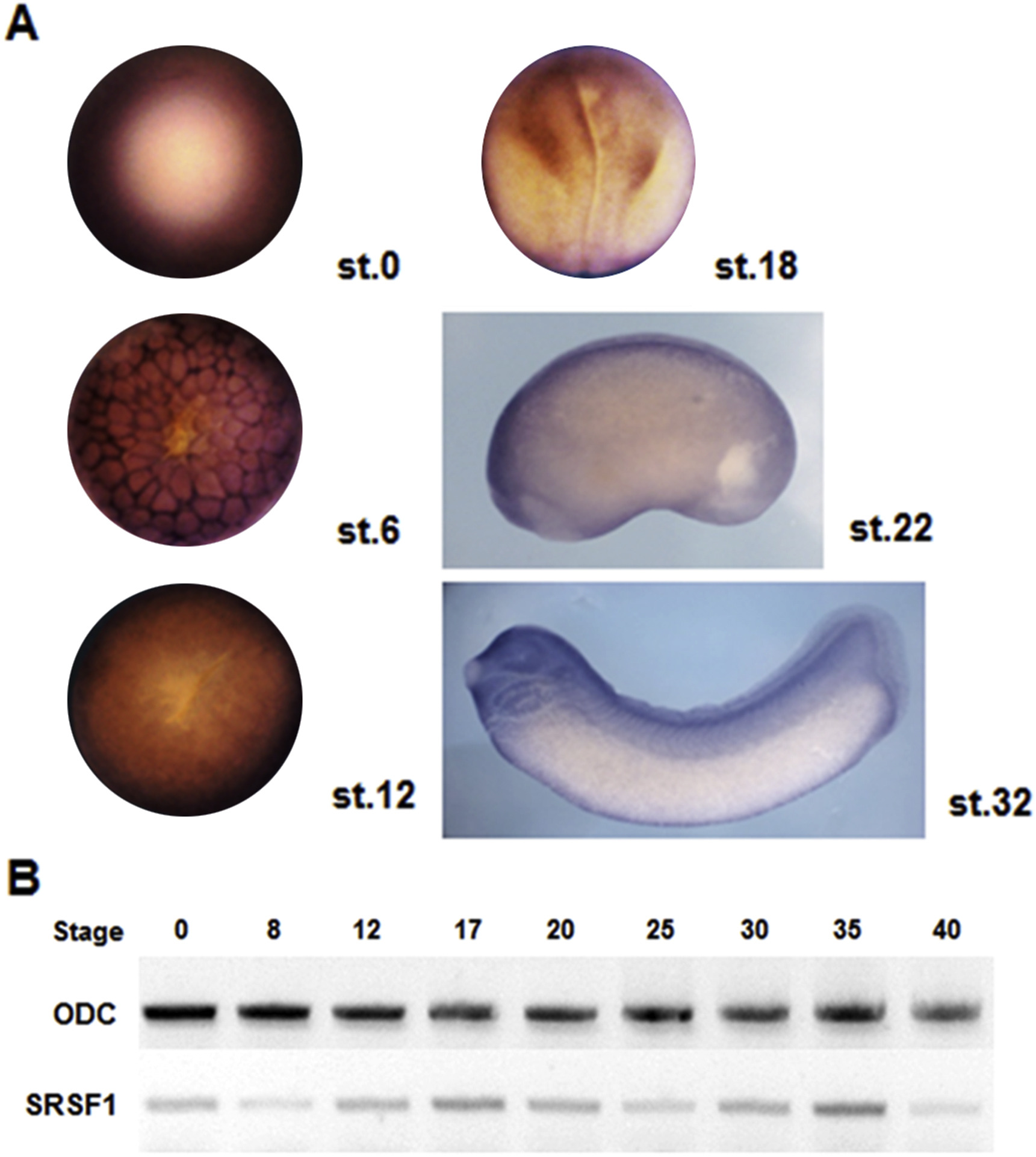Spatial-temporal expression profiles of SRSF1 during Xenopus embryogenesis. (A) Spatial expression of SRSF1 was determined by whole-mount in situ hybridization of Xenopus embryos from stage 0â32. SRSF1 is mainly localized in the animal hemisphere in an early embryo (â¼stage 6) and sequentially widens to the vegetal hemisphere through gastrulation (â¼stage 12). At the late neurula stage, SRSF1 is expressed in the neural plate- (â¼stage 18) and then is strongly expressed in the central nervous system (CNS), including the front head, eye, and branchial arches (â¼stage 22 and stage 32). (B) Reverse transcriptase-PCR (RT-PCR) results to show temporal expression patterns of SRSF1. SRSF1 is continuously expressed from stage 0 embryos to stage 40 tadpoles and expression levels reduced from stage 0â8 were restored at gastrula stage (stage 17). This restored expression again decreased after the neurula stage but also increased and peaked at stage 35. Ornithine decarboxylase (ODC), was used as a loading control.