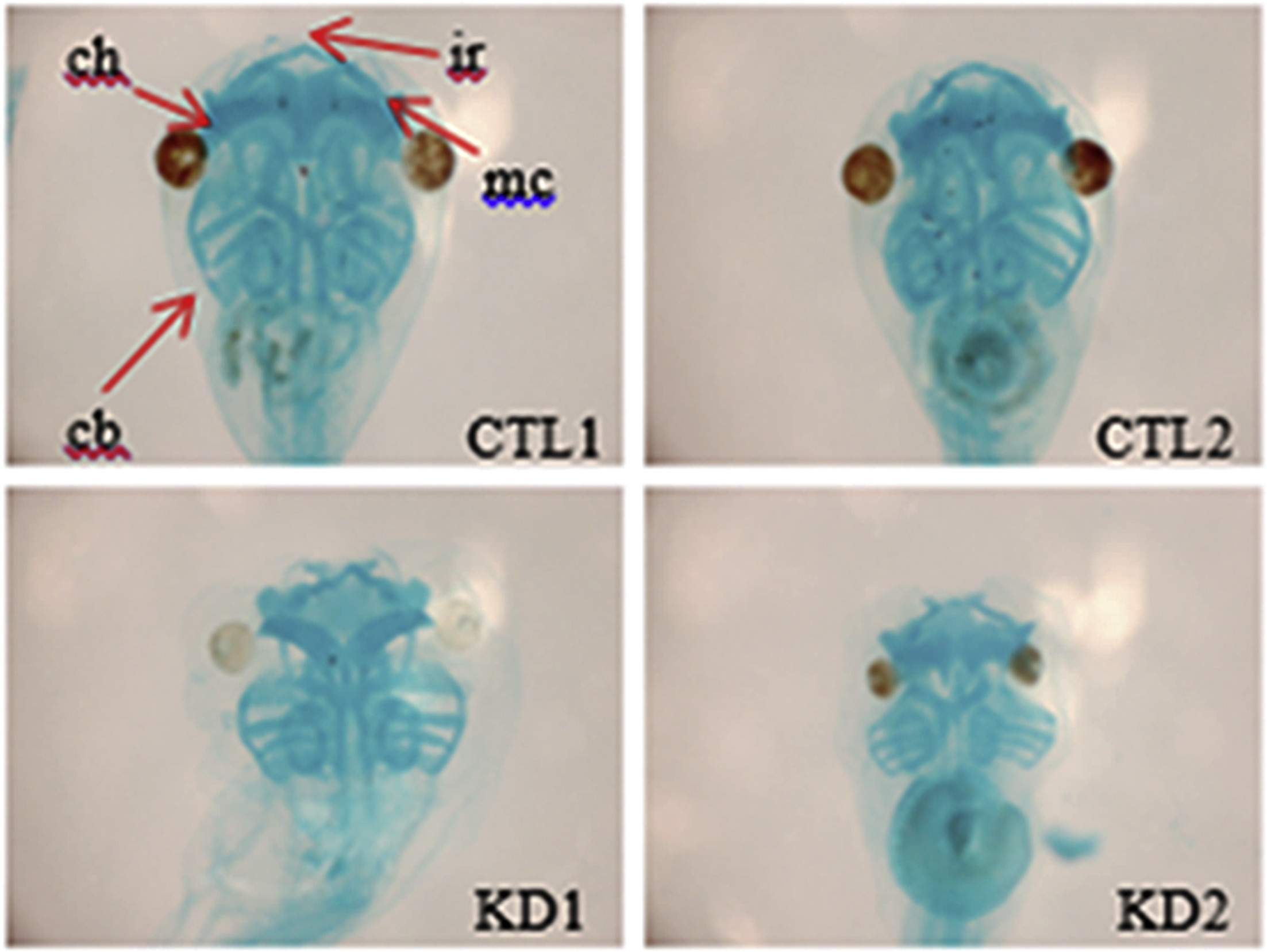 Loss of SRSF1 induces microcephaly by abnormal formation of braincartilage. Alcian blue staining was performed to show cartilage formation. SRSF1 MO-injected embryos showed abnormal cartilage shapes, such as cb, ch, ir, and mc (red arrows) compared to those of control MO-injected embryos; cb = ceratobranchial, ch = ceratohyal, ir = infrarostral, mc = Meckelâs cartilage. (For interpretation of the references to colour in this figure legend, the reader is referred to the web version of this article.)