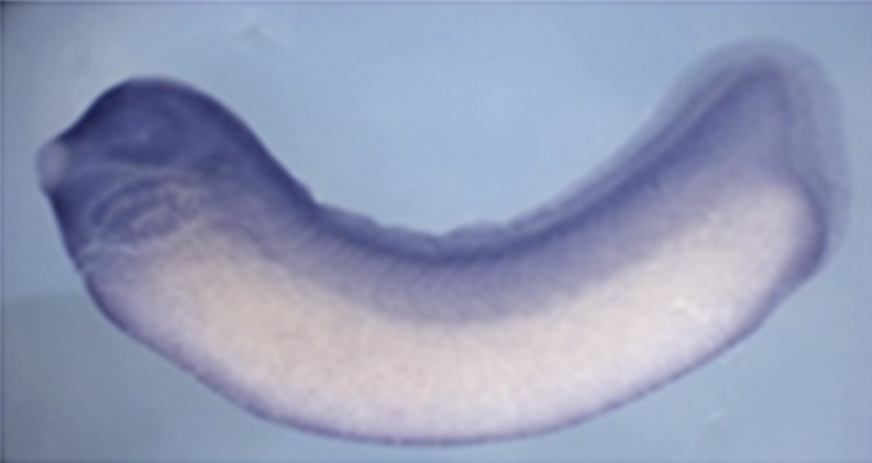srsf1 (serine/arginine-rich splicing factor 1) gene expression in Xenopus laevis embryo, assayed via in situ hybridization, NF stage 32, lateral view, anteriorleft, dorsal up.