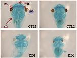 Loss of SRSF1 induces microcephaly by abnormal formation of braincartilage. Alcian blue staining was performed to show cartilage formation. SRSF1 MO-injected embryos showed abnormal cartilage shapes, such as cb, ch, ir, and mc (red arrows) compared to those of control MO-injected embryos; cb = ceratobranchial, ch = ceratohyal, ir = infrarostral, mc = Meckelâs cartilage. (For interpretation of the references to colour in this figure legend, the reader is referred to the web version of this article.)