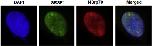 Exogenous Xenopus SRSF1 is expressed in nuclear speckles. Exogenously expressed Xenopus SRSF1 proteins were localized in the nucleus, especially in the nuclear speckles in HeLa cells. NSrp70 was used as a control because it is a known nuclear speckle protein and interacts with SRSF1 physiologically. (Blue: DAPI, Green: SRSF1, Red: NSrp70). Immunohistochemistry was performed to show localization.