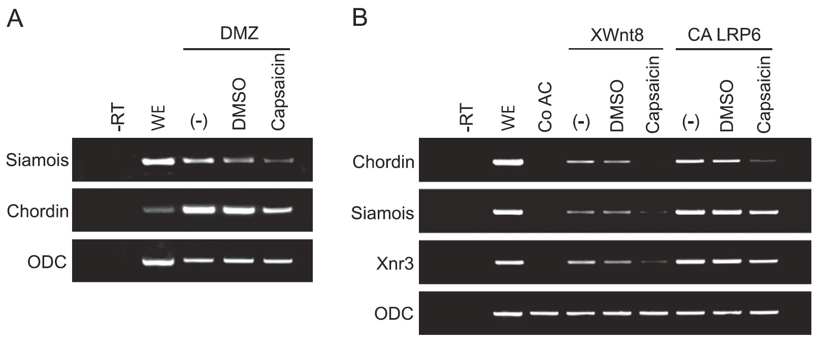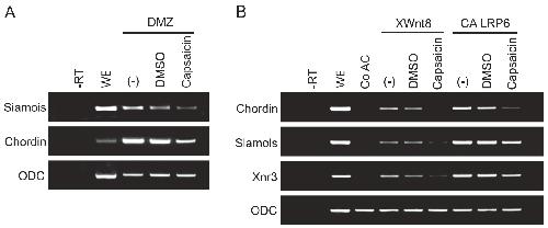 Fig. 2. Capsaicin inhibits the expression of Wnt target genes. (A) Dorsal marginal zone (DMZ) tissues were excised from the embryos that were cultured in the presence of capsaicin