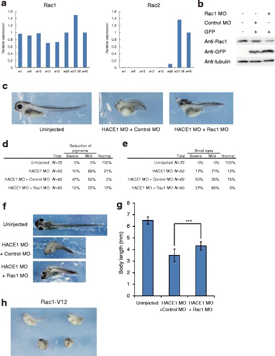 Fig. 6. Defects in hace1 morphants are partly rescued by coinjection of Rac1 MO. a Temporal expression patterns of Xenopus laevis rac1 and rac2. The expression levels of rac1 and rac2 were analyzed by qRT-PCR. Expression levels were normalized to those of Xenopus laevis ornithine decarboxylase 1 (odc1). b Immunoblot analysis shows that Rac1 MO inhibited translation of endogenous Rac1. Xenopus laevis embryos were injected with the indicated MOs (70 ng in total) and gfp mRNA (0.2 ng). α-tubulin was a loading control. c Coinjection of Rac1 MO (50 ng) and HACE1 MO (30 ng) led to milder developmental defects than did coinjection of control MO (50 ng) and HACE1 MO (30 ng). Anterior is to the left, and dorsal is to the top. d, e Embryos were classified into severe, mild, and normal groups on the basis of the extent of each defect. f, g The body length of embryos at stage 40-41 was quantified. Dorsal views of embryos are shown with anterior to the left. Values are expressed as the meanâ±âs.d. ***Pâ<â0.001, unpaired t-test h Embryos injected with 30 pg of Rac1-V12 (constitutively active Rac1) mRNA and 170 pg of gfp mRNA displayed phenotypes similar to those of embryos injected with HACE1 MO (nâ=â38). Anterior is to the left, and dorsal is to the top |